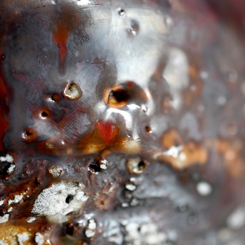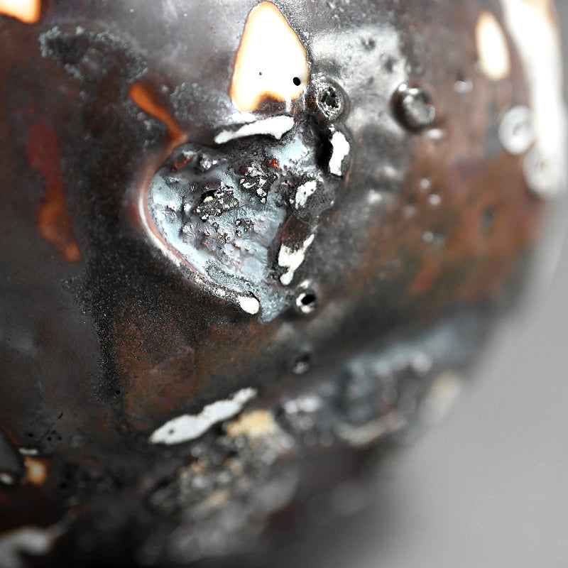 Murakoshi Takuma is one of those enigmas who simply lives to work with clay. He does not seek to make a living through pottery, but through his primal approach has earned a following which keeps his work in high demand. He was born in Aichi prefecture in 1954 and began his stroll down the pottery path in 1980 under the tutelage of Kyoto potter Umehara Takehira. Favoring very rough Shigaraki glaze, he established his own kiln in 1997 in the Kiyomizu pottery district of Kyoto, then moved to Nagaoka in 2002. Although eschewing the world of competitive exhibitions, he has been picked up by many of Japan’s preeminent galleries, including private exhibitions at the prestigious Kuroda Toen of Tokyo’s Ginza District.