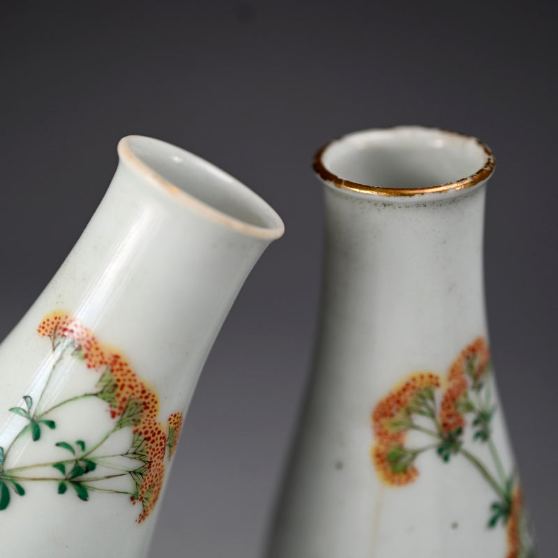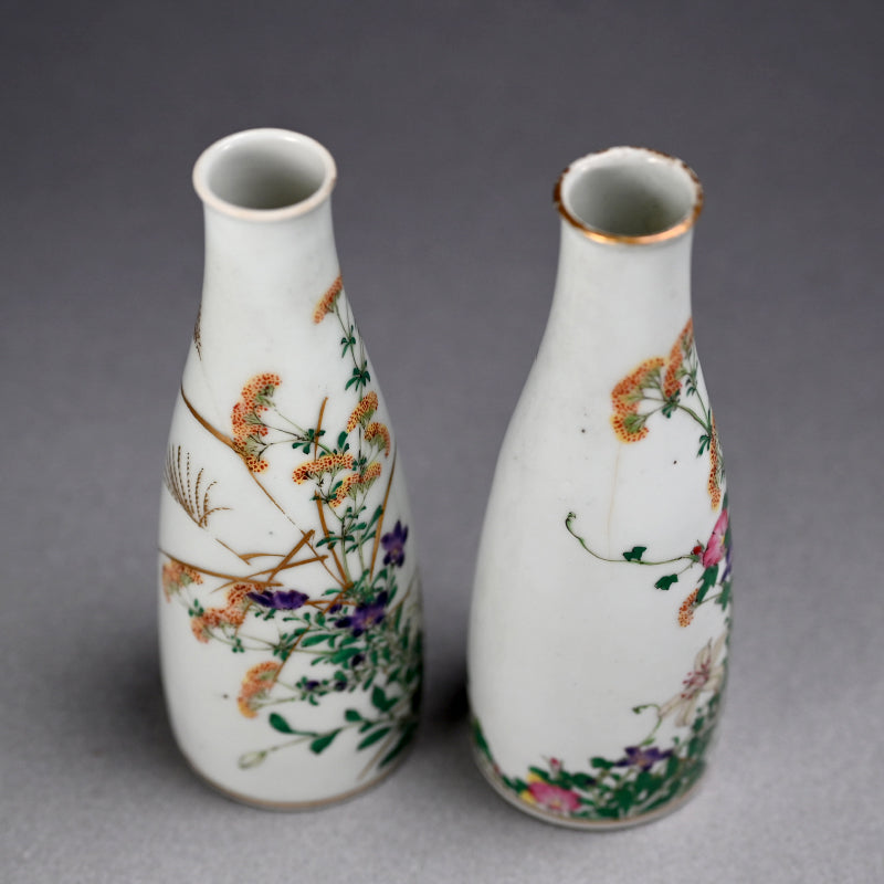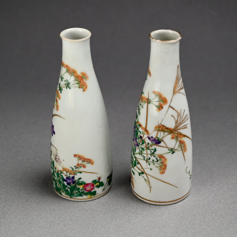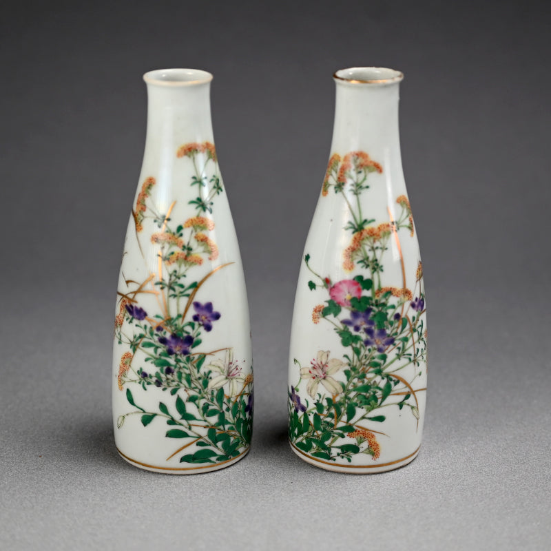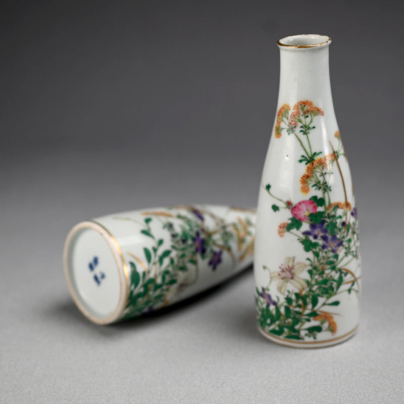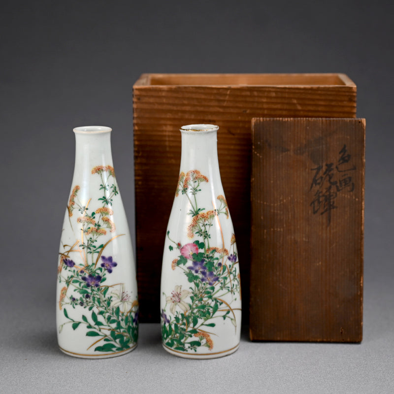Floral sprays in vivid color decorate this set of Tokkuri sake flasks by Kanzan Denshichi enclosed in the original signed wooden box. Each is 5.5 cm (2 inches) diameter, 16 cm 6-1/4 inches) tall and in excellent condition.