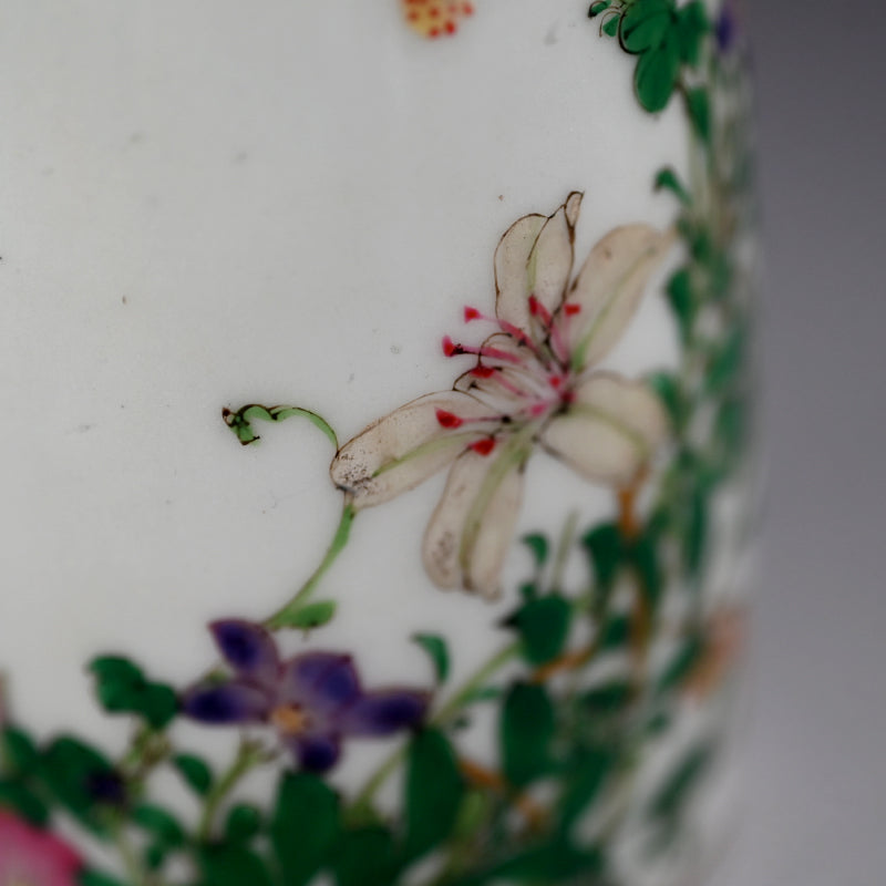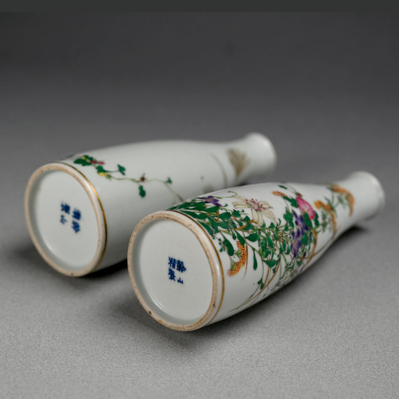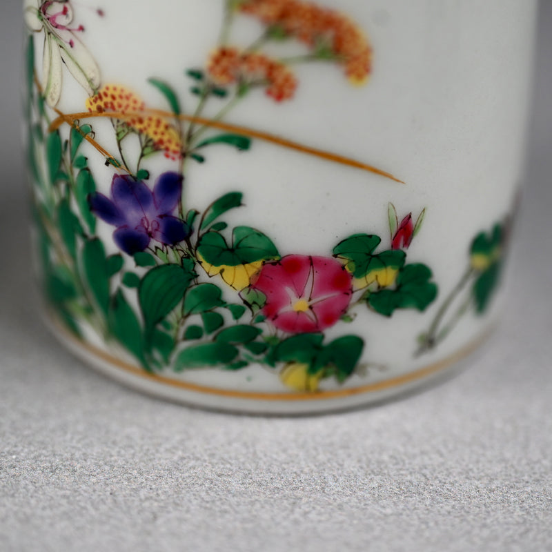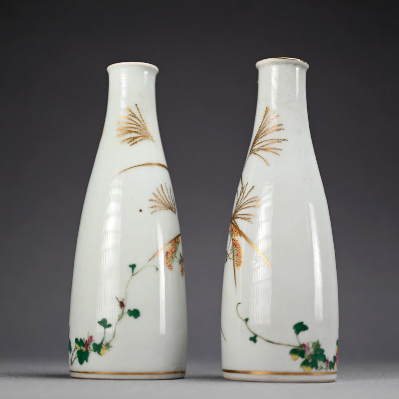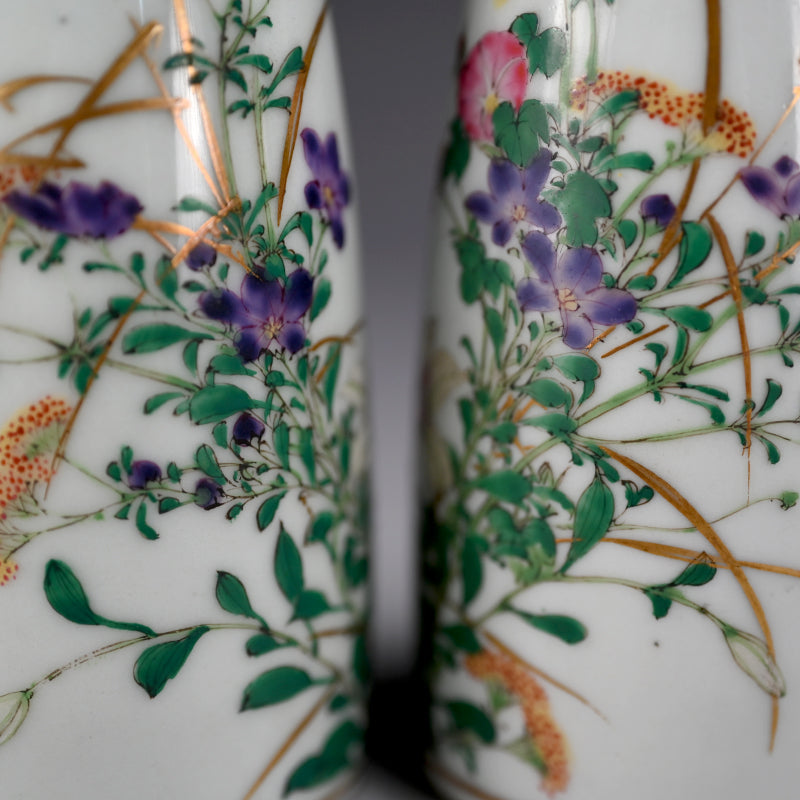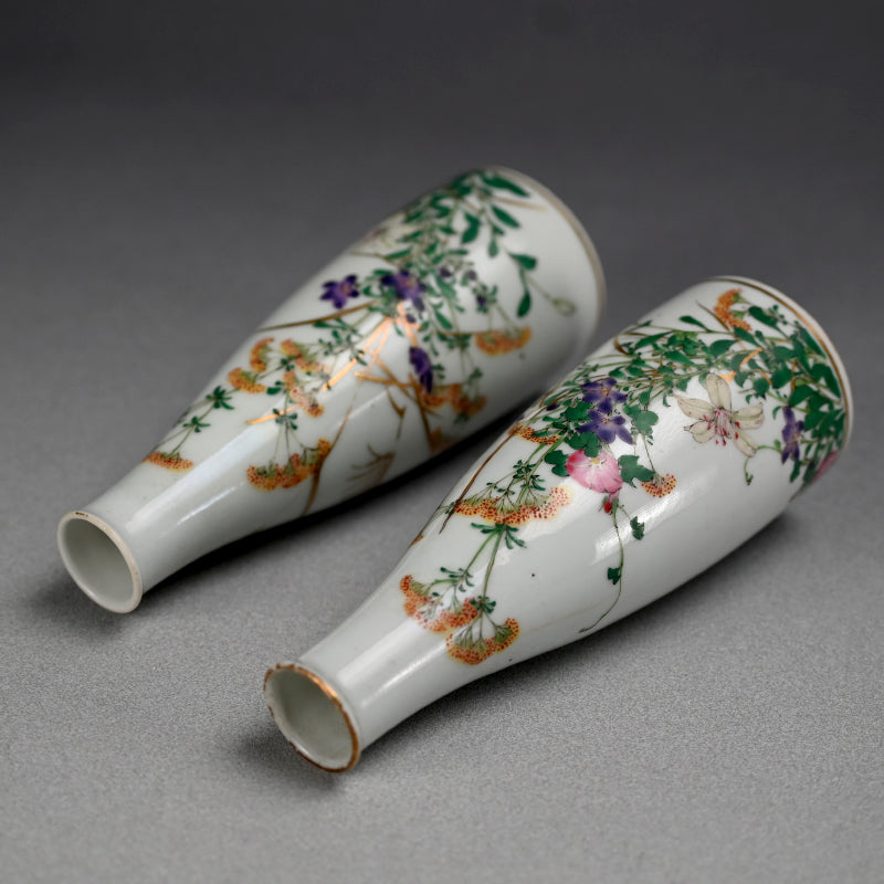 Floral sprays in vivid color decorate this set of Tokkuri sake flasks by Kanzan Denshichi enclosed in the original signed wooden box. Each is 5.5 cm (2 inches) diameter, 16 cm 6-1/4 inches) tall and in excellent condition.