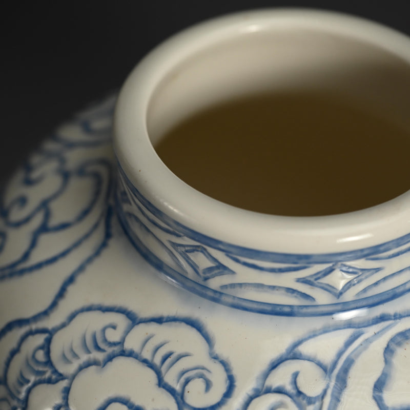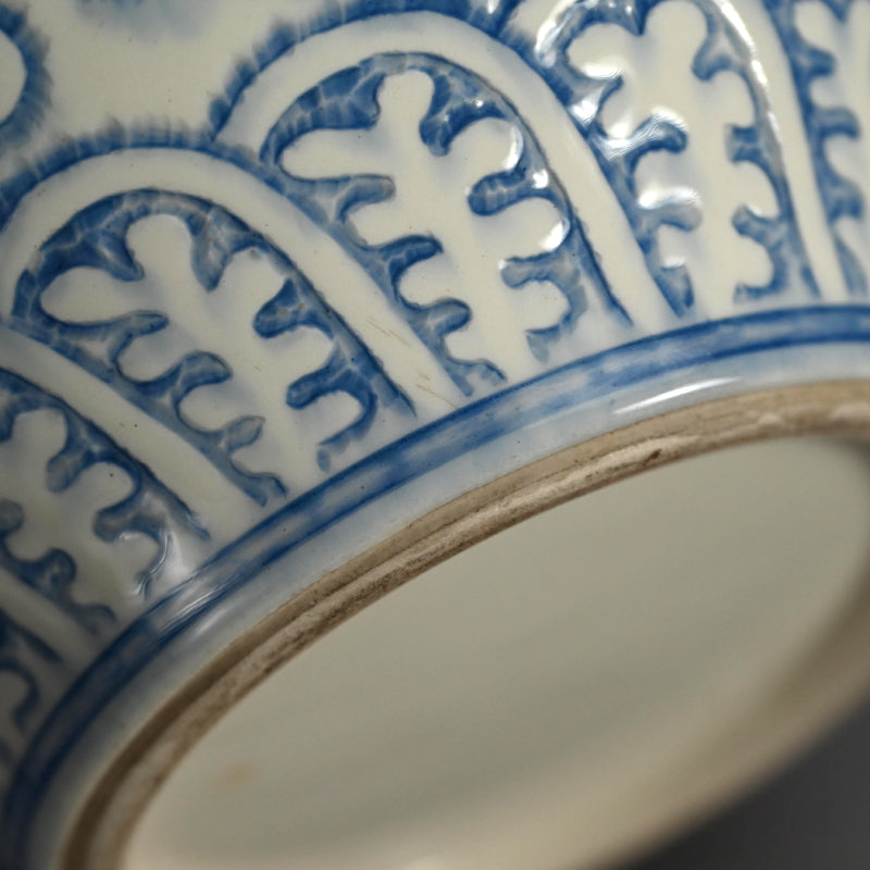 A very unusual modern Minpei vase in blue and white, the blue etchedinto the surface in a very unusual technique. In fact it was created by carving the imagery into the vessel, glazing in white then blue, then wiping away the bulk of the blue glaze, leaving only that which was in the deep recesses. Thus you are left with a “negative” version of the design in blue. It is 22 cm (9 inches) diameter, 25.5 cm (10 inches) tall and in excellent condition, dating circa 1925. It comes in the original wooden box signed Minpei-kama Zo.
