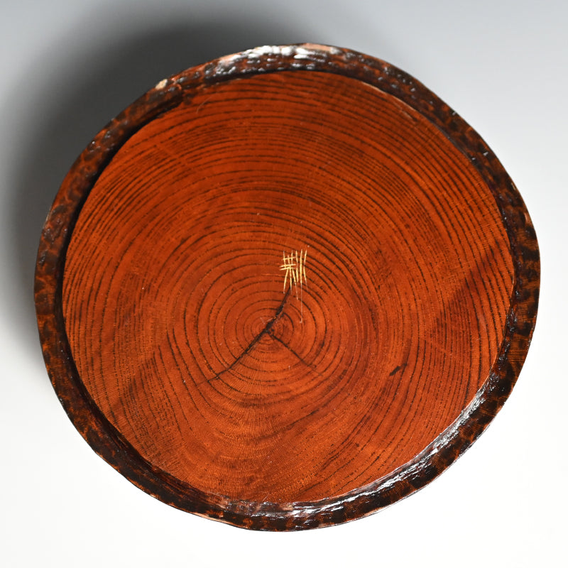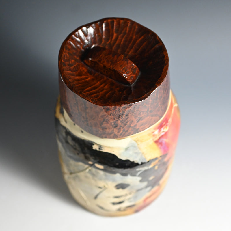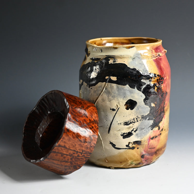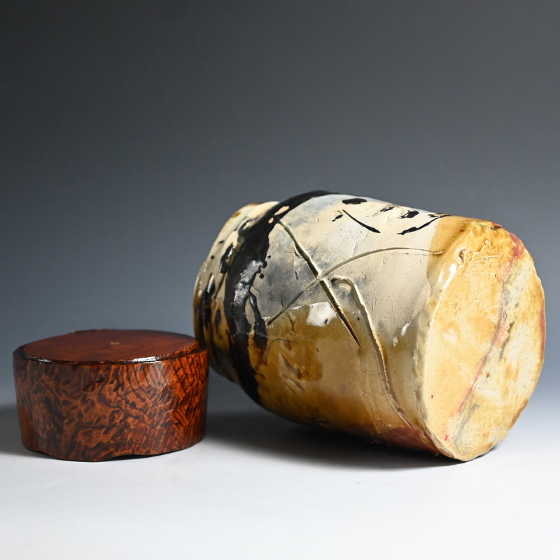 A jaunty thick wood lid sits astride this simple ceramic form covered in random earth tones and dramatic strokes of black by Koie Ryoji enclosed in the original singed wooden box titled Mizusashi. Drops of spilled ink and a bit of blank canvas (raw earth) varying from white to gray are deeply scored, wth washes of red tinged Ki-seto yellow glaze like a minimalist painting from the 1950s. Up one side runs a series of blank dots where it was supported on its side in the kiln. The lid is hand chiseled from a chunk of hardwood, and is signed by the maker beneath. The urn is 22 cm (just less than 9 inches) tall, 16.5 cm (6-1/2 inches) diameter and in excellent condition.