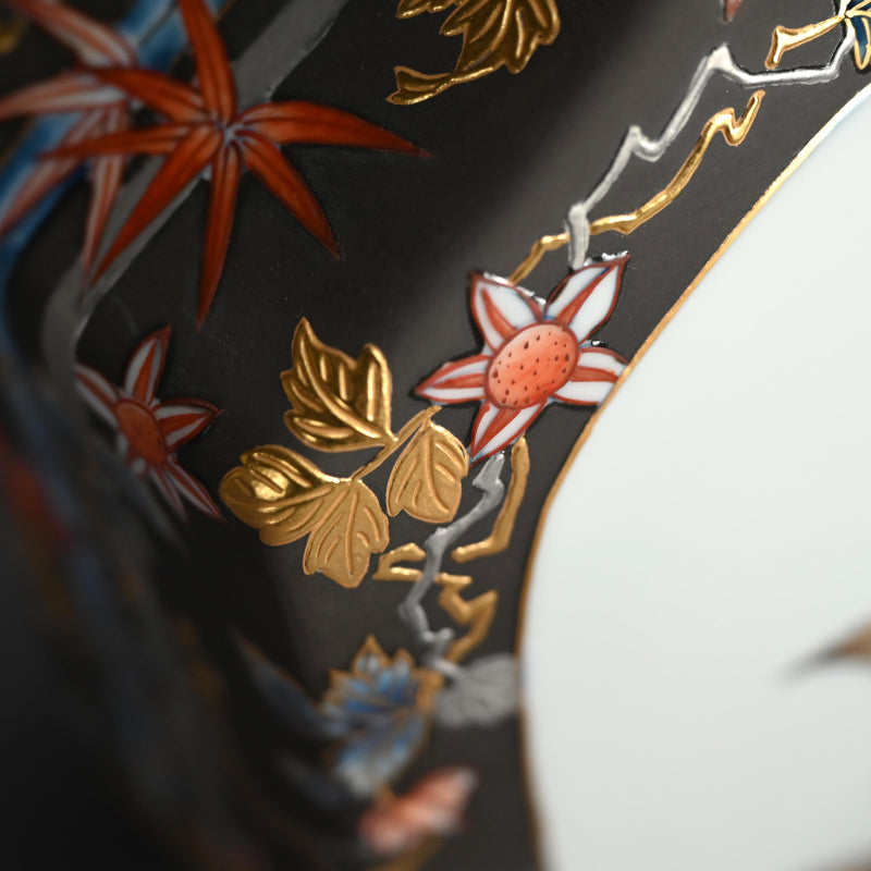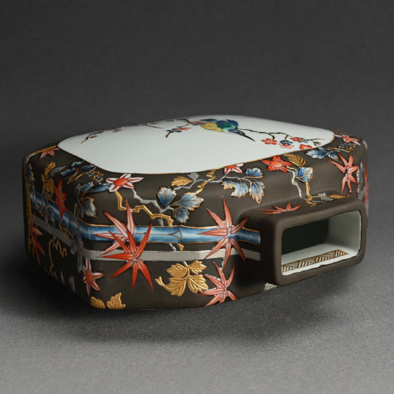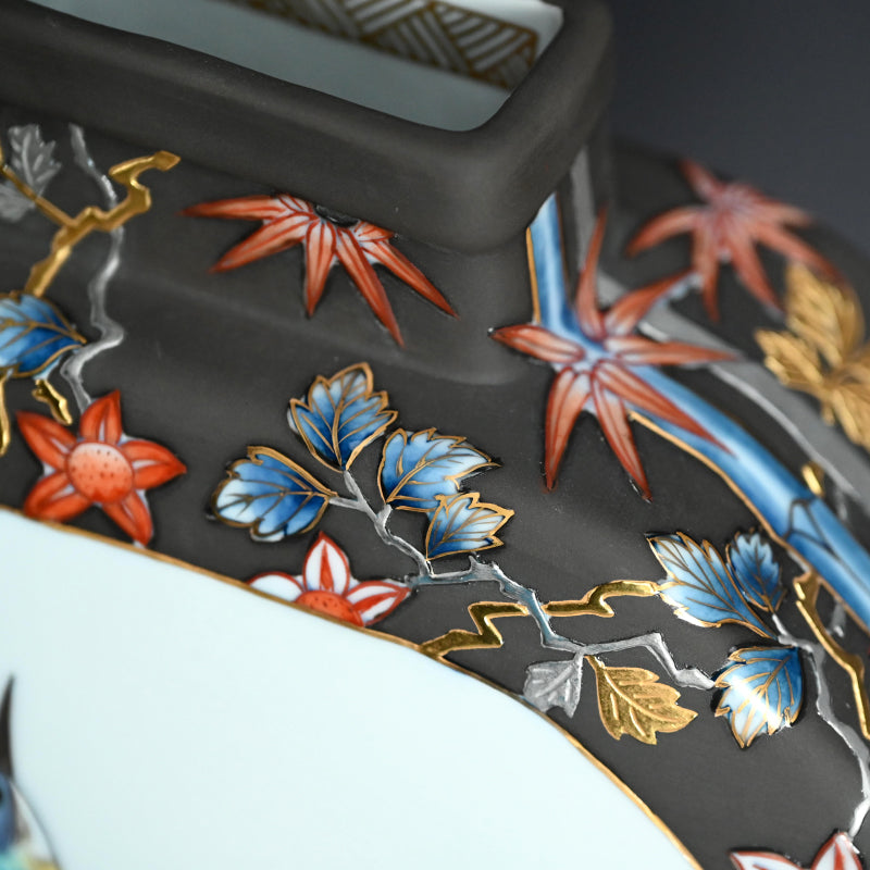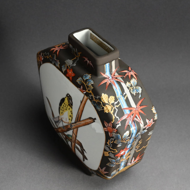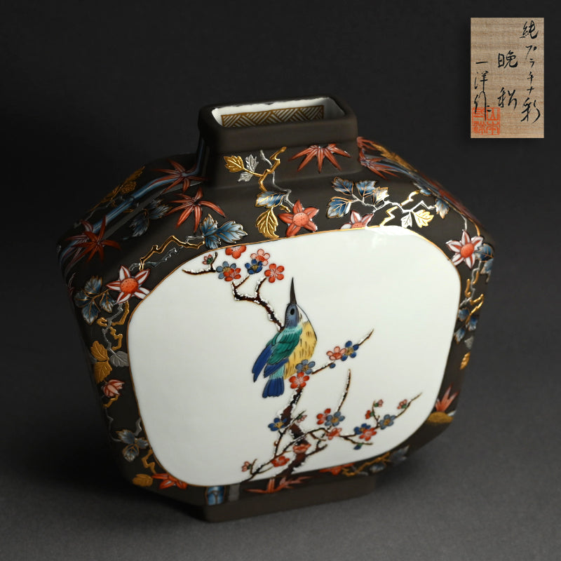 A very unusual vase by Yamamoto Ichiyo enclosed in the original signed wooden box titled Jun Purachina-sai Banshu. The flattened form is wrapped in dark gray with brilliant flowering vines accented with gold and platinum surrounding windows containing colorful birds perched on Autumn and winter branches. It is 24 x 11 x 23.5 cm (9-1/2 x 4-1/2 x 9-1/2 inches) and is in excellent condition.