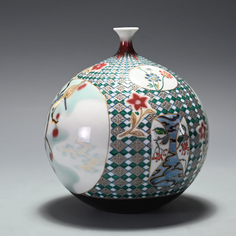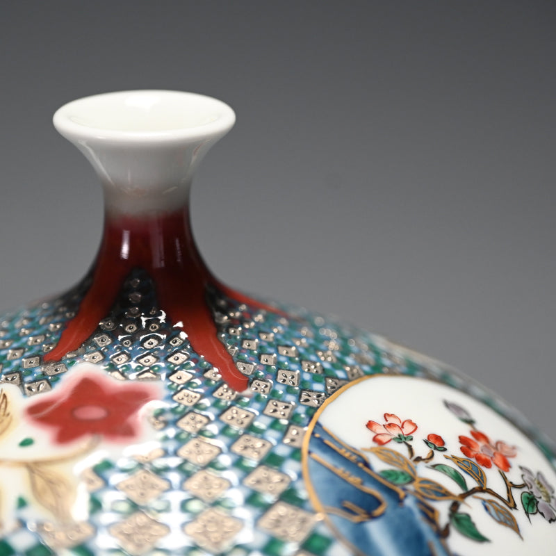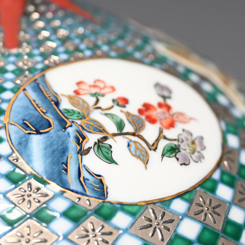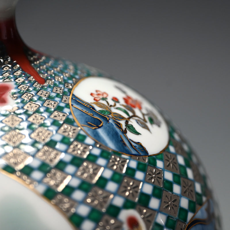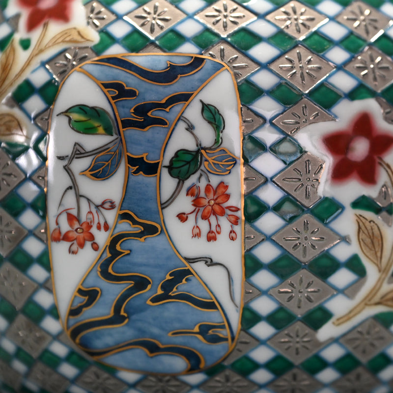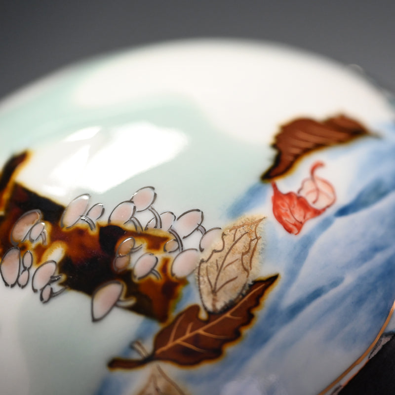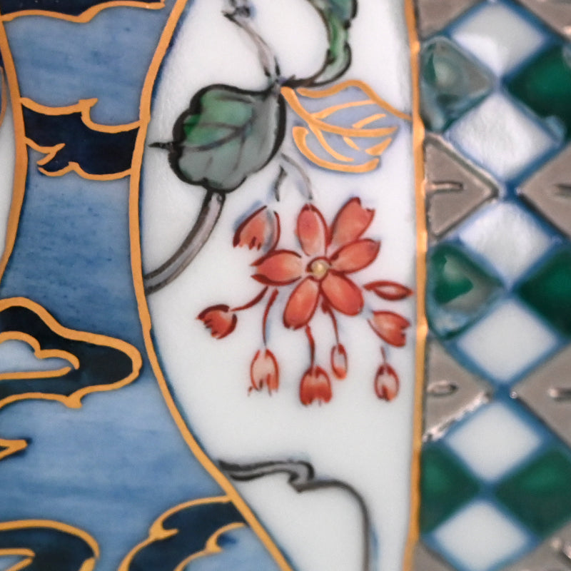 Yamamoto Ichiyo was born in Nagasaki in 1944. He began his career at an Arita Porcelain ceramic facility in 1969. In 1974 he would spend a year in Taiwan studying porcelain before returning to Japan, where he would establish his own kiln in Imari the following year. He would begin research into platinum glazing in the mid eighties, garnering awards in Paris three years running (1986, ’87, ’88) after which he would move to Takatsuki on the border between Osaka and Kyoto, where he would immerse himself in cultural studies. In 1993 he would move to Hyogo prefecture, then would begin a period where his fame would grow, while his roots in any one place did not, only returning to Imari nearly a decade later in 2001. Since his work has been exhibited throughout Japan and abroad in such places as Valencia, Los Angeles, New York and San Diego.