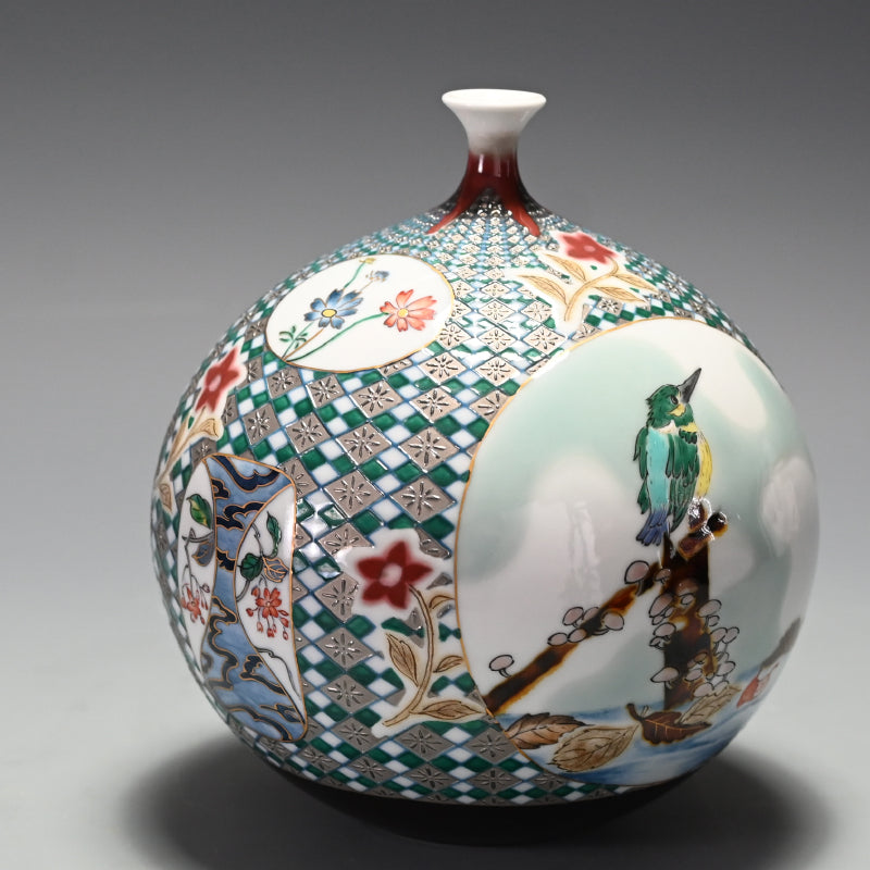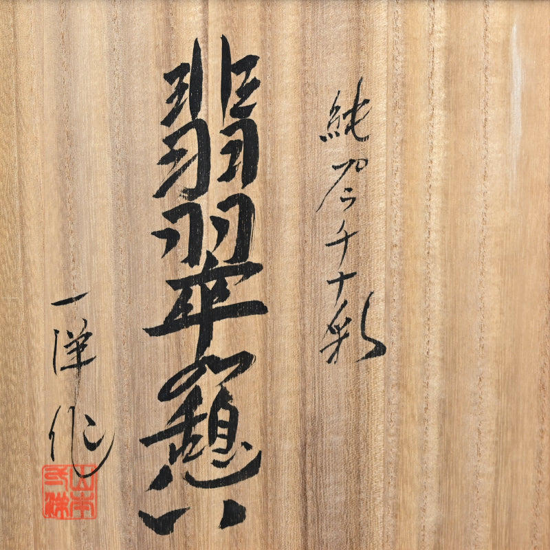 A stunning vase by Yamamoto Ichiyo in his signature Platinum glaze enclosed in the original signed wooden box titled Jun-purachina-sai Kawasemi no Ikoi (Song of the Kingfisher). It is 19.5 cm (roughly 8 inches) diameter, 21cm (8-1/2 inches) tall and in perfect condition.