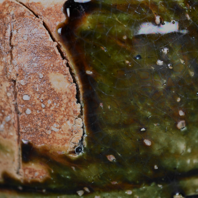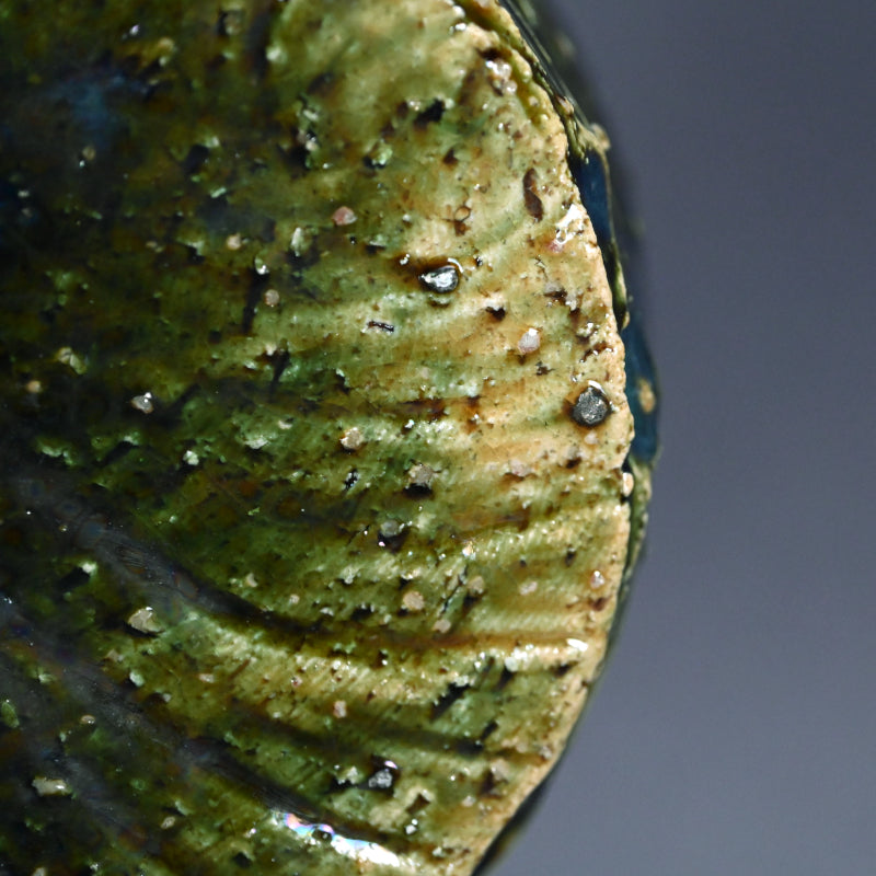 A crusty wide vessel by Koie Ryoji dripping with green glaze over raw earth congealing into blue around shell impressions by Koie Ryoji enclosed in the original signed wooden box titled simply Tsubo. It is 17.5 cm (7 inches) diameter, 15.5 cm (over 6 inches) tall and in excellent condition.