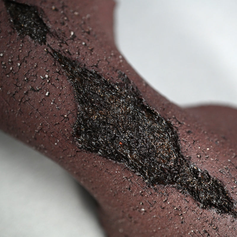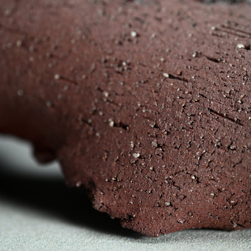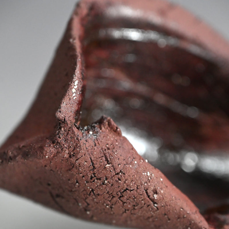 A striking wall-mounted ceramic object by Mukai Naoko, titled Yukaku, a term suggesting a healing or protective shell—something akin to a scab formed over a wound. The elongated form appears almost like a fragment of organic matter—part shell, part dried leaf—its irregular edges curling inward to reveal a dark, glossy interior that contrasts dramatically with the matte, iron-rich exterior surface. Fired to a deep reddish-brown tone and scattered with subtle granular textures, the outer skin carries the quiet evidence of flame and clay interacting in the kiln, while the interior cavity gleams with a molten, lacquer-like darkness. In this way the work evokes the natural process by which a wound seals itself, forming a protective crust that both conceals and preserves what lies beneath. Mounted vertically, the piece suggests a suspended natural fragment or geological shard discovered and preserved upon the wall. The tension between the fragile, torn silhouette and the dense ceramic body lends the work a quiet intensity, transforming clay into something that feels simultaneously fossilized and alive. The object measures approximately 35.5 cm (14 inches) long, 12.5 cm (5 inches) wide, and 8 cm (3-1/8 inches) deep, and remains in excellent condition, acquired directly from the artist. The title suggests the idea of gently soothing the “shell” of oneself—the hardened exterior formed by stress or fatigue. It can express the act of caring for one’s own inner and outer self, suggesting a process of mental and physical healing, as if tending to the protective shell that surrounds the individual. This work connects the material transformation of clay to a biological process—damage, protection, and healing. That idea resonates very strongly with Mukai’s vocabulary of skins, shells, reefs, and porous surfaces across the works we have encountered from her oeuvre.