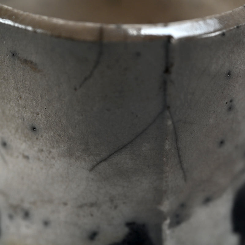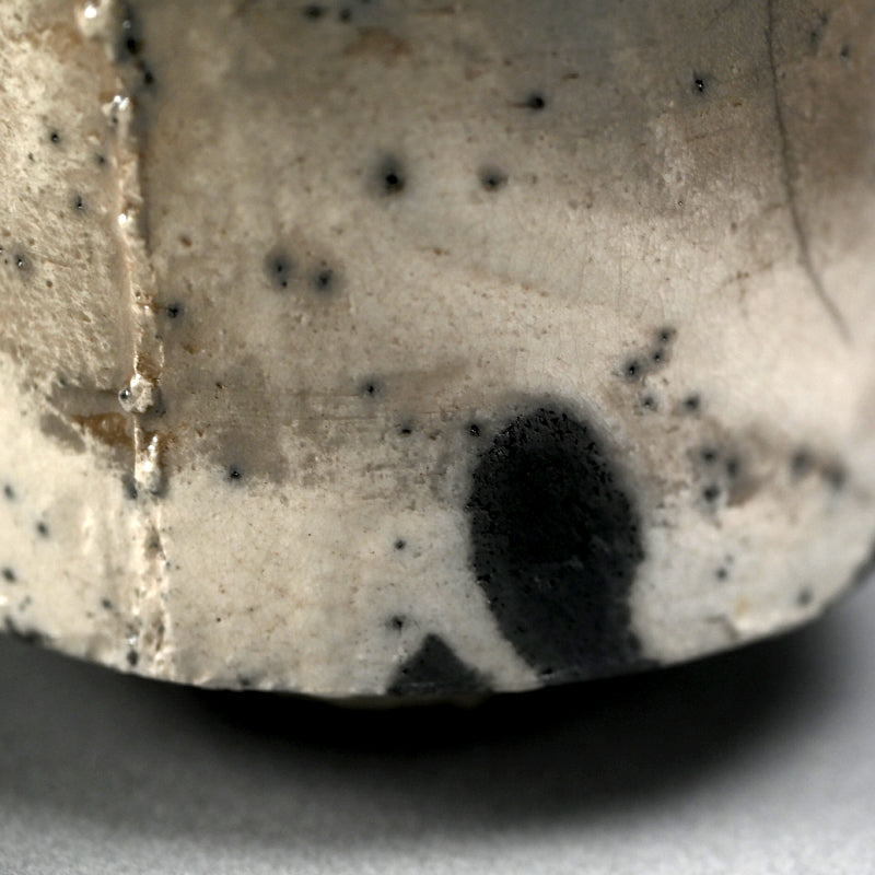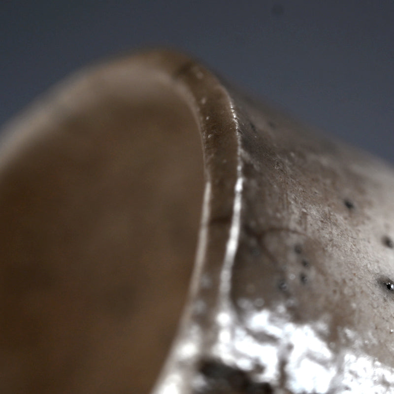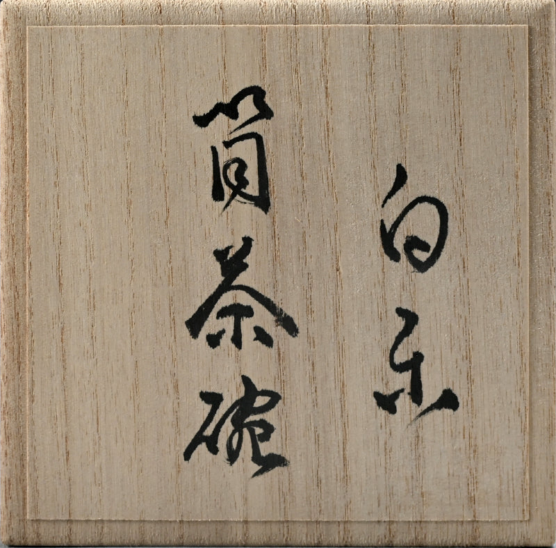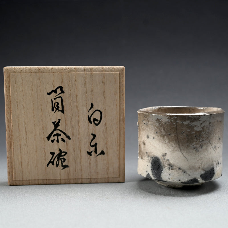 Silver glimmers on the milky white surface of this haunting white tea bowl by Hashimoto Tomonari enclosed in the original signed wooden box titled Shiro Raku Tsutsu Chawan. This wide-spread glimmering silver effect is unique to this piece among the works we hae acquired by him this show. It is 11.5 cm (4-1/2 inches) diameter, 10 cm (4 inches) tall and in excellent condition.