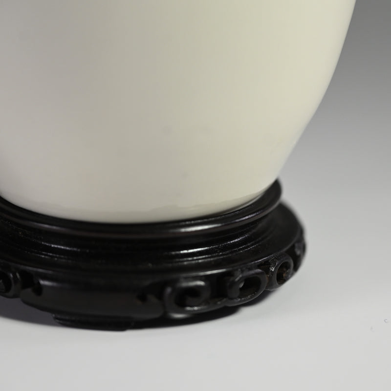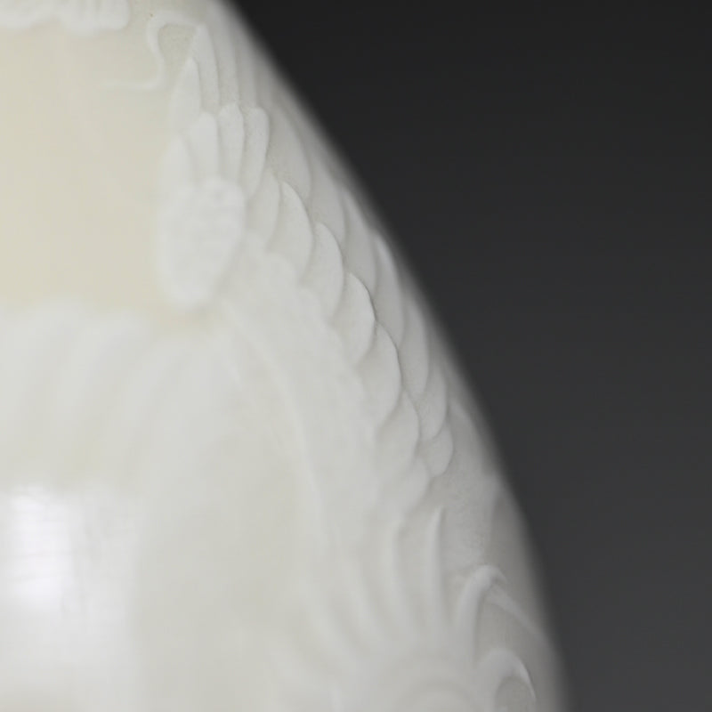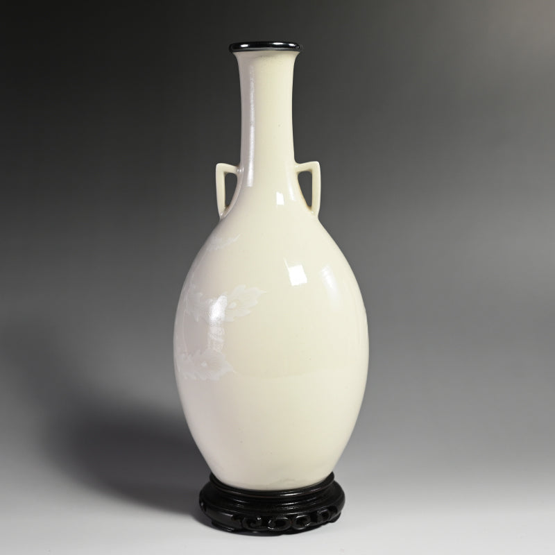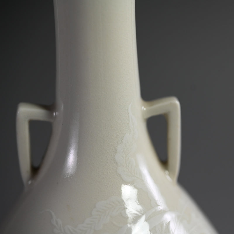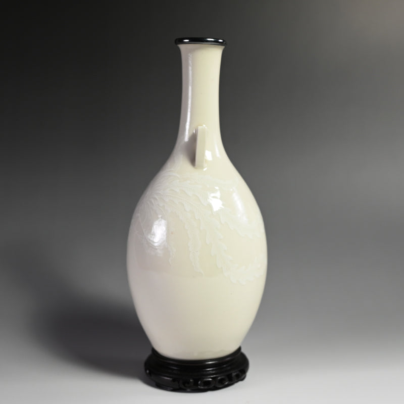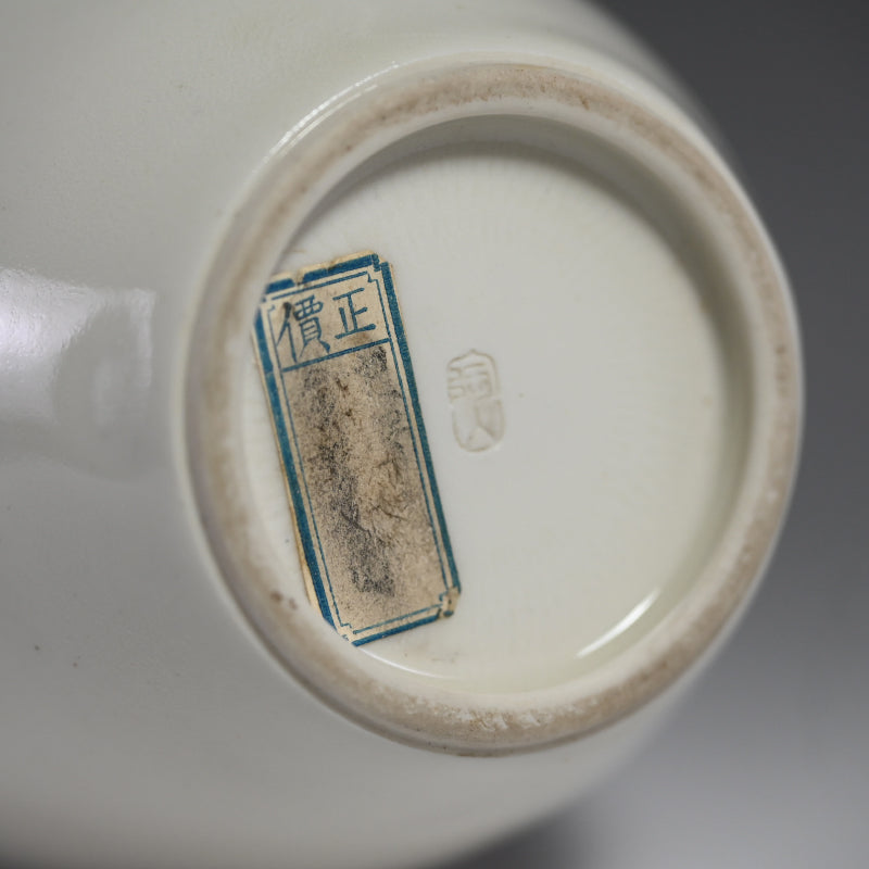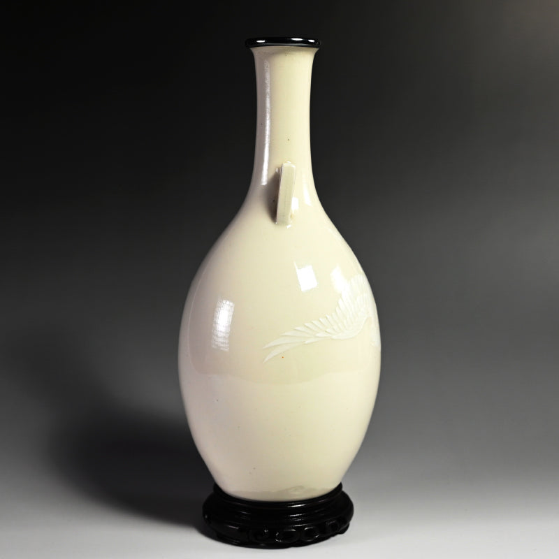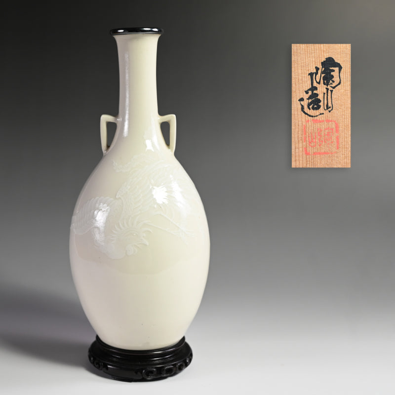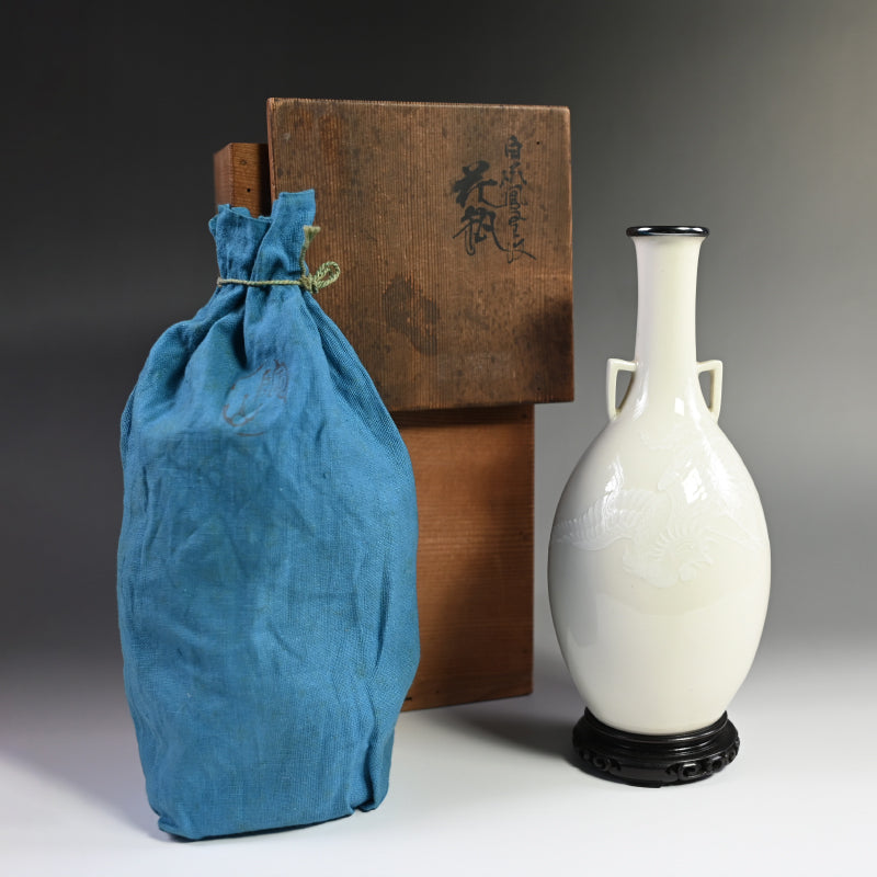 A white vase adorned with an even whiter phoenix in slight relief by Teishitsu Gigei-in Ito Tozan enclosed in the original signed wooden box titled Hakuji Ho-o Mon Kabin. It is 22 cm (just less than 9 inches) tall, 10 cm (4 inches) diameter and in excellent condition. It comes wrapped in a cloth pouch with the original rosewood stand. Serving as buffer at the bottom of the box was a number of sheets of paper written in both English and French as well as Japanese, and we have kept them for posterity.