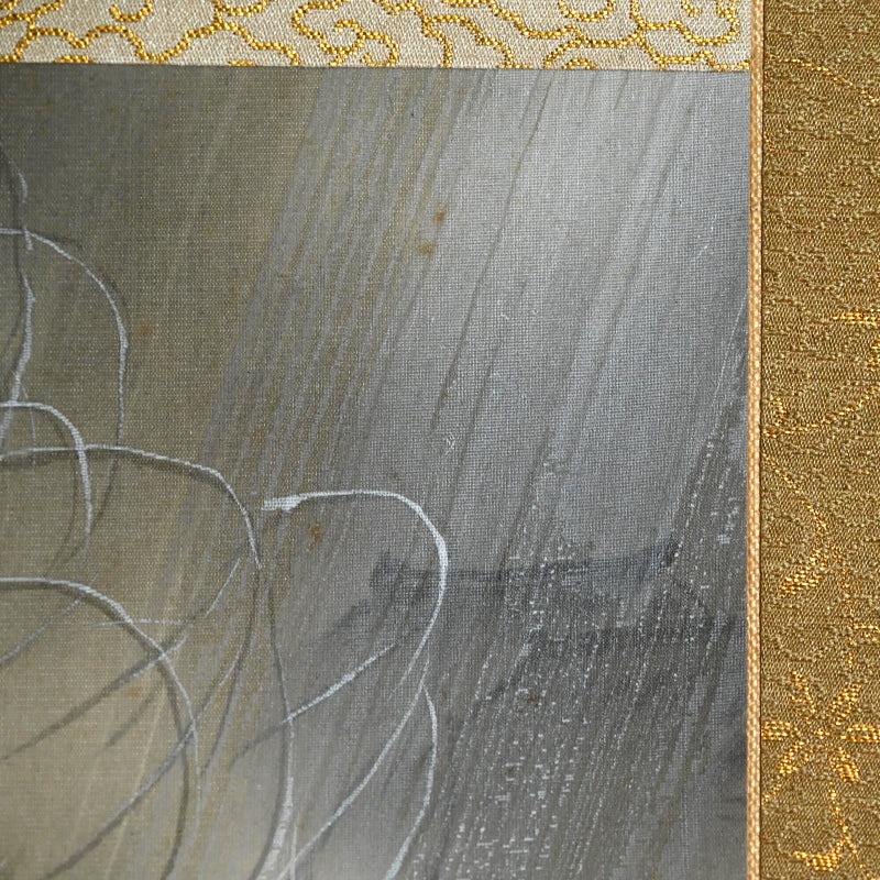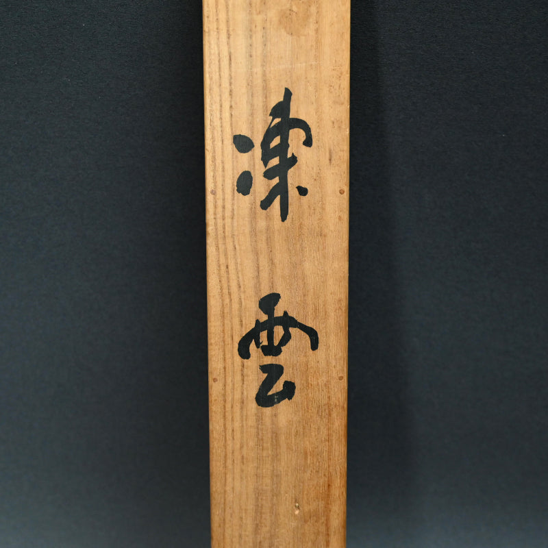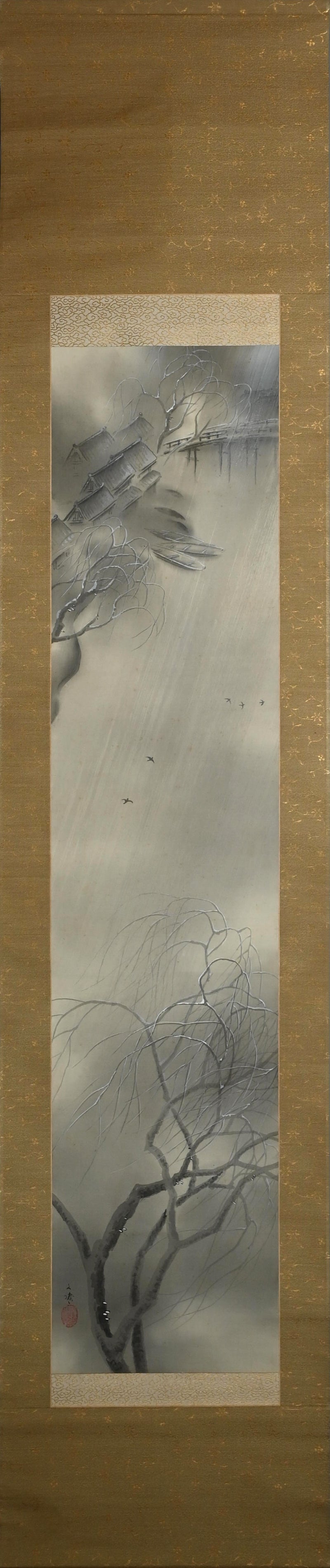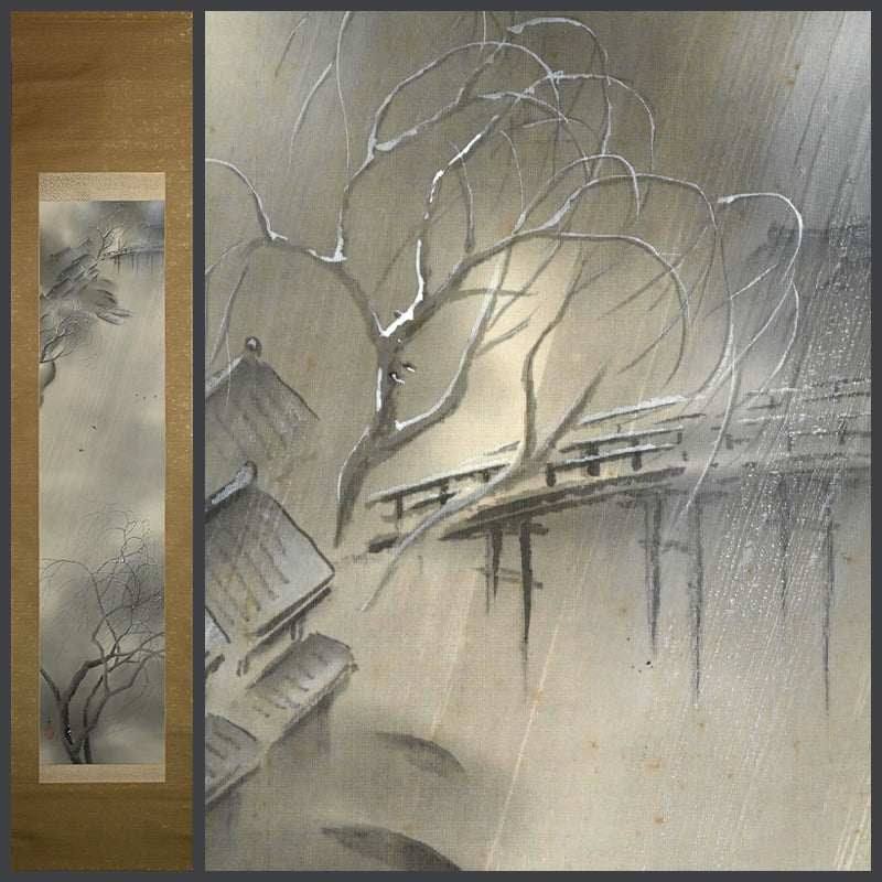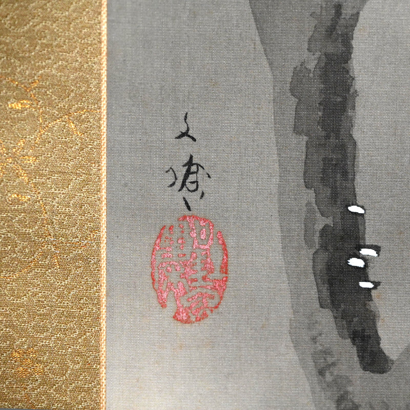 Bunto enclosed in the original wooden box titled Rei-un (frozen cloud).  Looking into the scene one can almost hear the wind whipping the bare willow branches.  It is performed with pigment and ink on silk in a silk border with bone rollers.  It is 40 x 193 cm (16 x 78 inches) and is in fine condition.