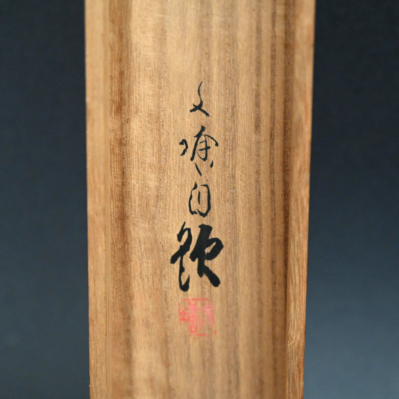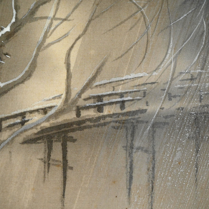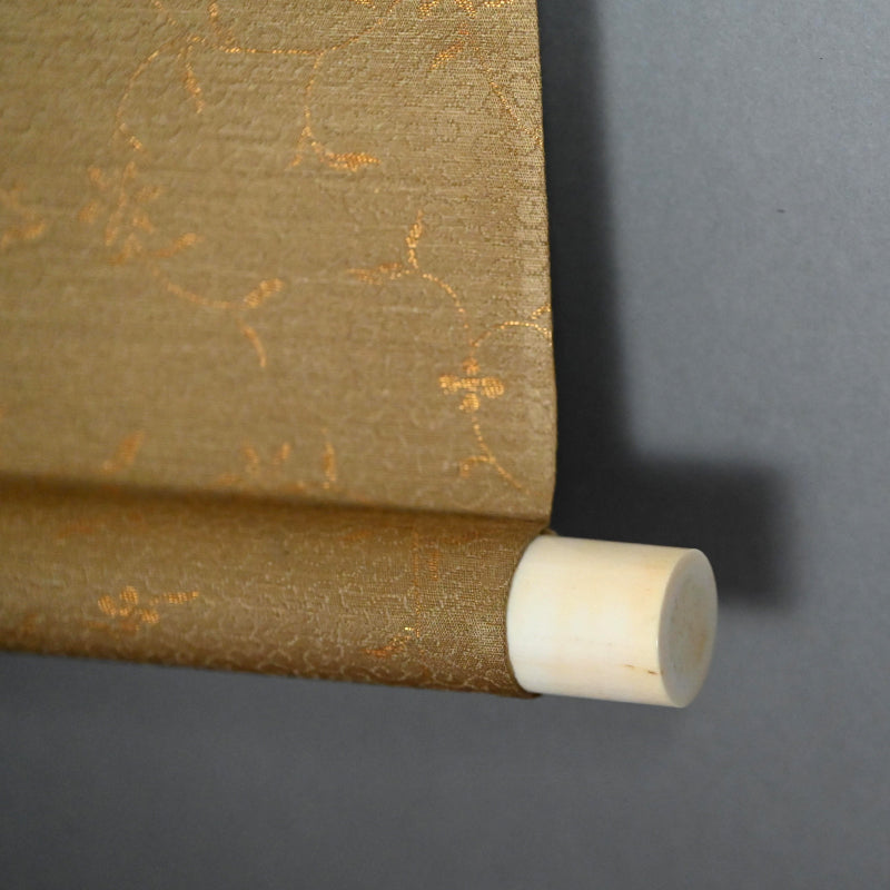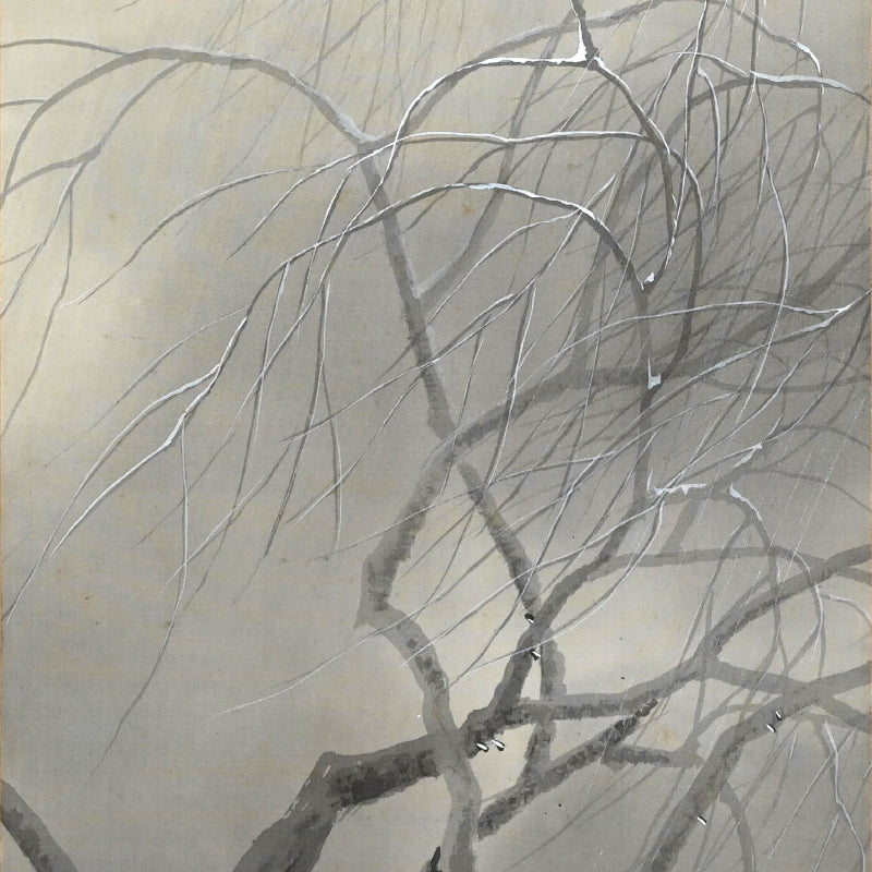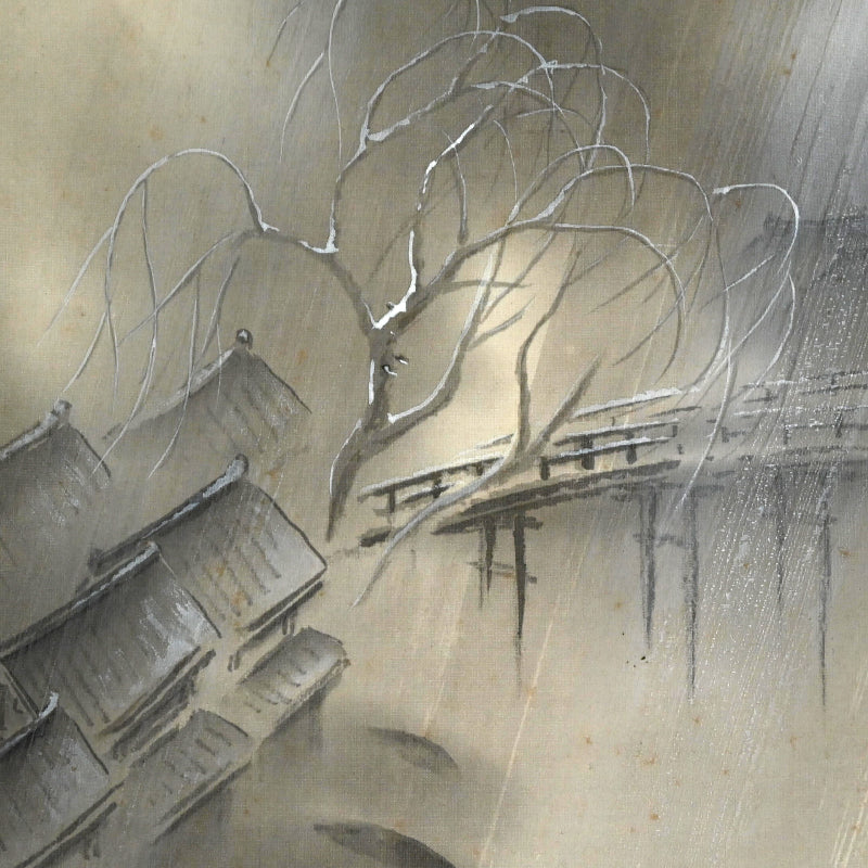 Bunto enclosed in the original wooden box titled Rei-un (frozen cloud).  Looking into the scene one can almost hear the wind whipping the bare willow branches.  It is performed with pigment and ink on silk in a silk border with bone rollers.  It is 40 x 193 cm (16 x 78 inches) and is in fine condition.