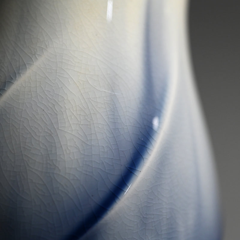 An elegant swirling form in crackled white clouded with purple by important female potter Tokuda Junko (Yasokichi IV) enclosed in the original signed wooden box titled Saiyu Koro. It is 18 cm (7-1/4 inches) tall to the top of the finial and in excellent condition.