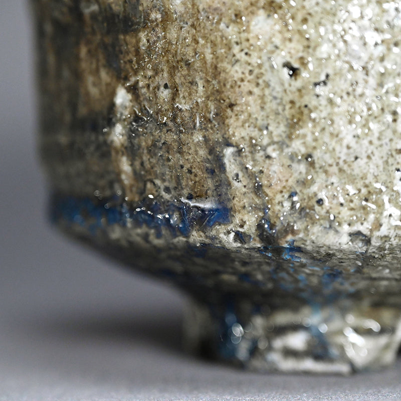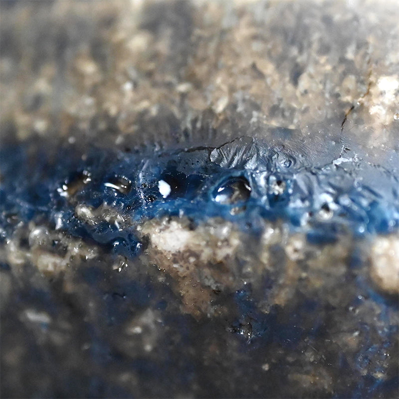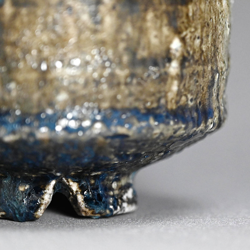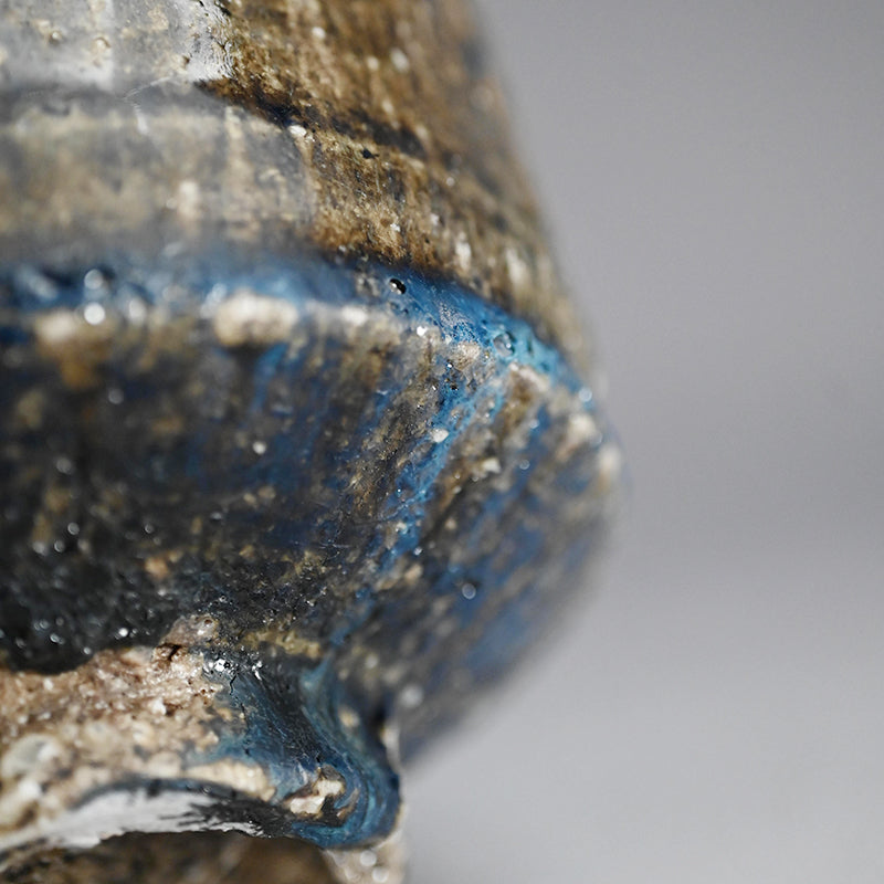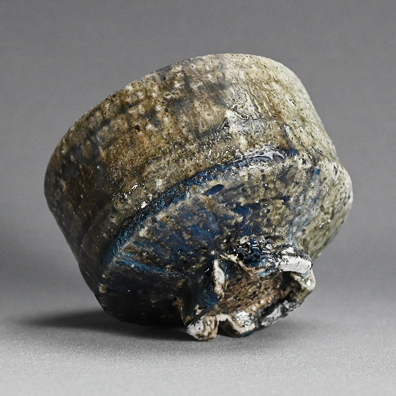 A Natural ash glazed matcha tea bowl by Doi Masafumi, an artist trained in the fine tea tradition of Kyoto who creates works that balance everyday usability with a striking sense of design. The final color of each piece remains unknown until the firing is complete, and among his many bowls, this one stands out for the exceptionally beautiful blue that emerged from the kiln. The bowl measures 12.5 x 8.8 cm (5 × 3 1/2 inches) and comes housed in an original wooden box signed by the artist, titled Yohen Chawan (Kiln‑altered Tea Bowl). It was obtained directly from the artist at the end of 2025 and is in new condition.