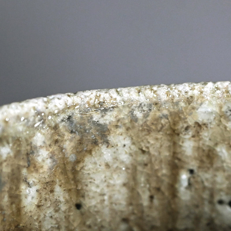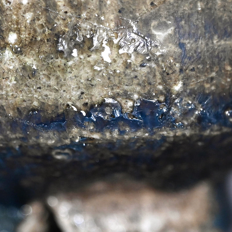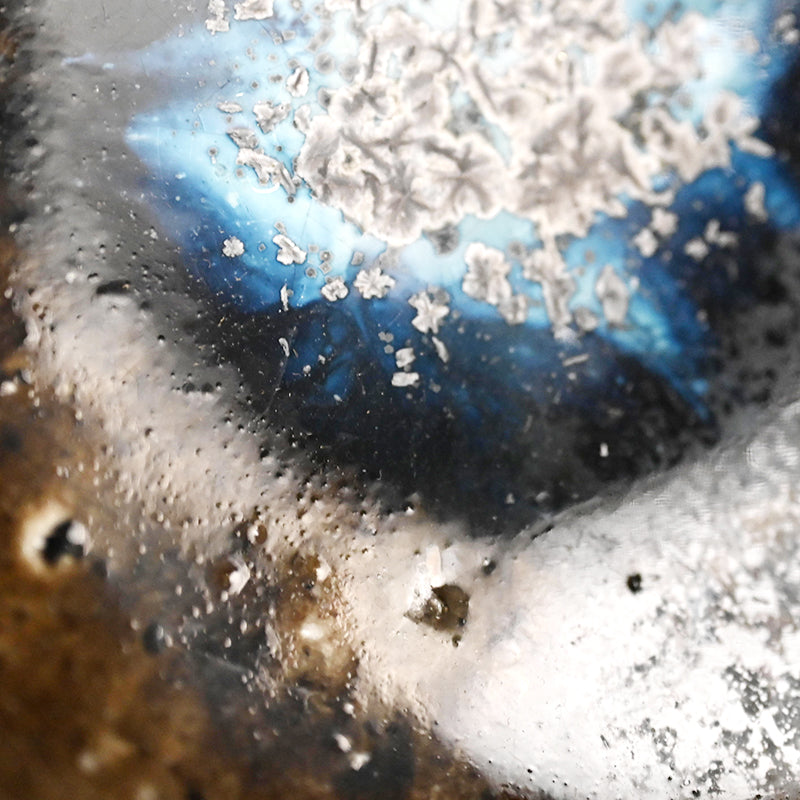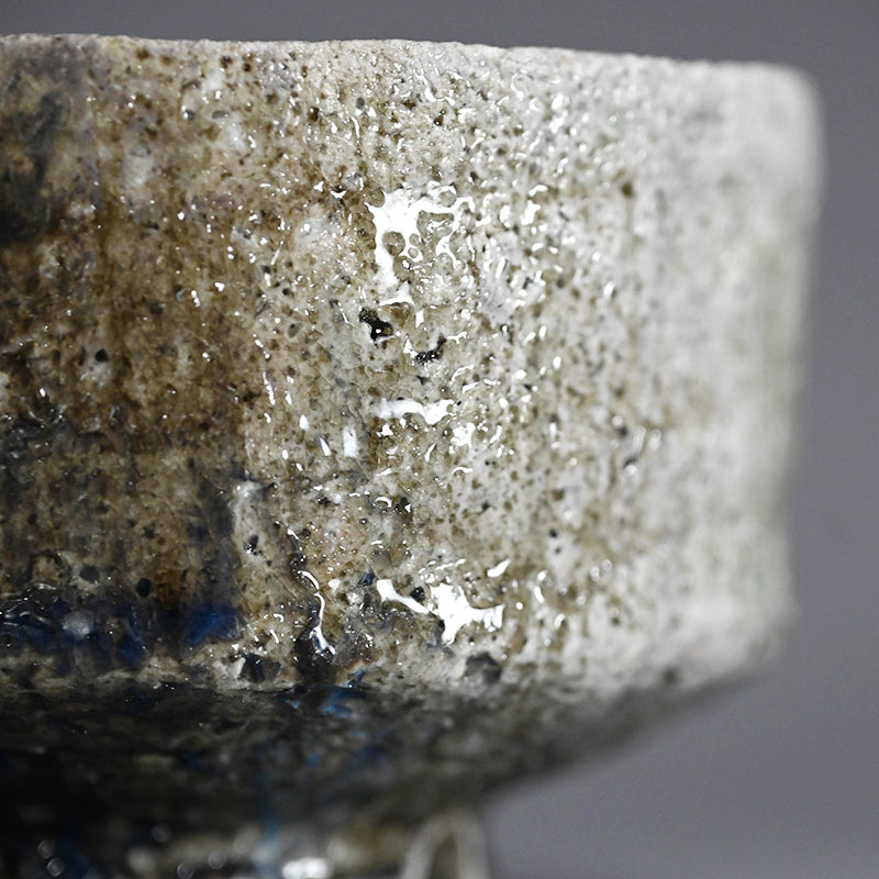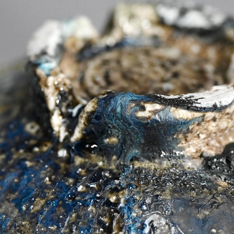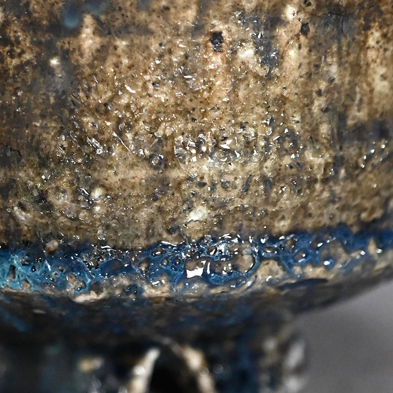 A Natural ash glazed matcha tea bowl by Doi Masafumi, an artist trained in the fine tea tradition of Kyoto who creates works that balance everyday usability with a striking sense of design. The final color of each piece remains unknown until the firing is complete, and among his many bowls, this one stands out for the exceptionally beautiful blue that emerged from the kiln. The bowl measures 12.5 x 8.8 cm (5 × 3 1/2 inches) and comes housed in an original wooden box signed by the artist, titled Yohen Chawan (Kiln‑altered Tea Bowl). It was obtained directly from the artist at the end of 2025 and is in new condition.